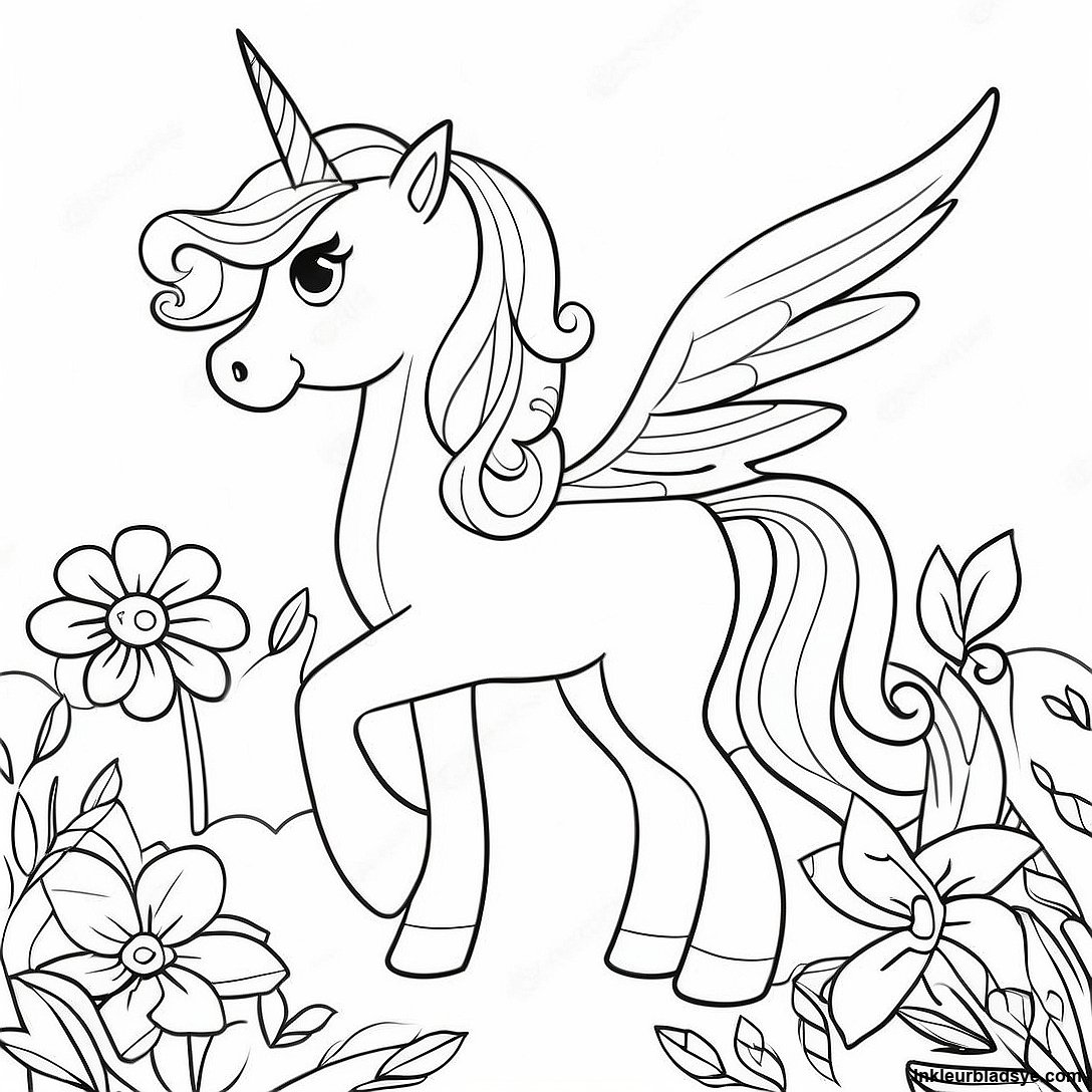 Laai Drukbare PDF af van Elegante Alicorn Tussen Blomme Inkleurblad