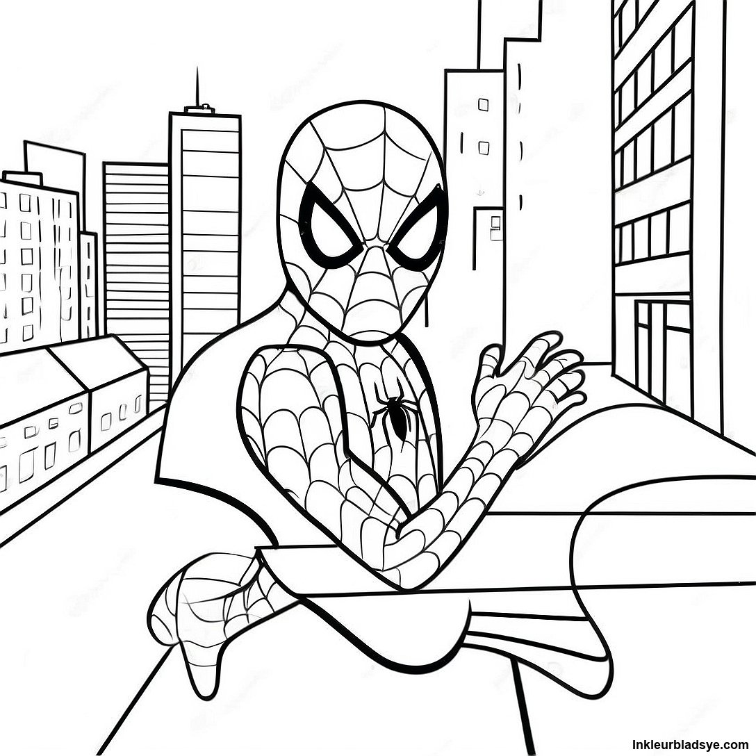 Spider Man wat deur die Stad Swang Inkleurblad